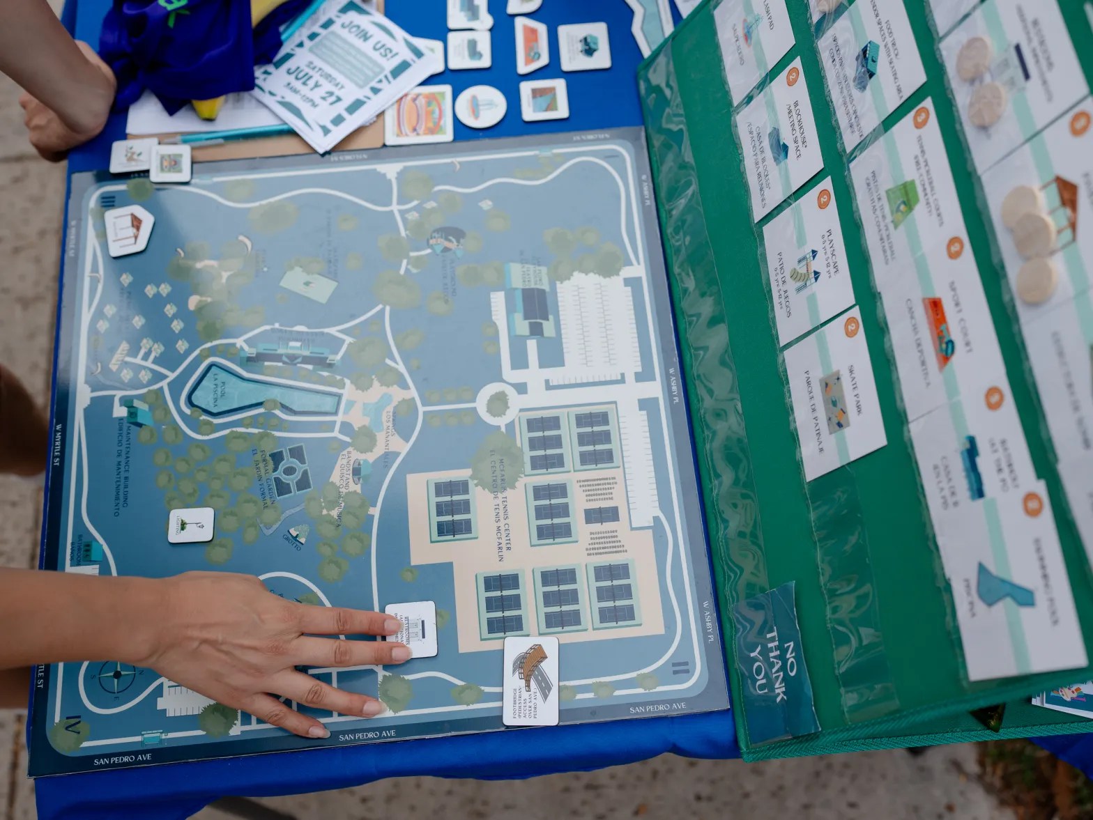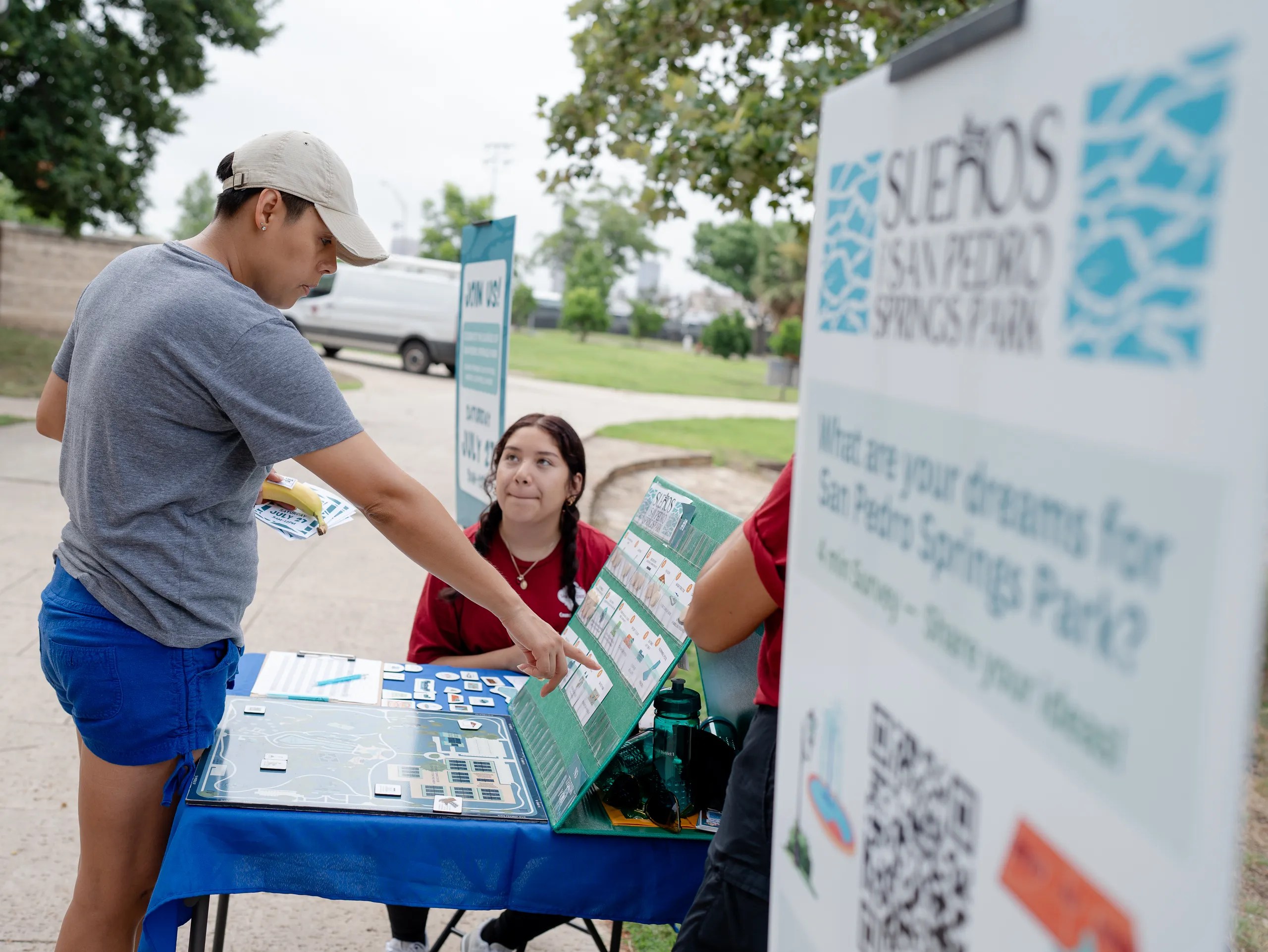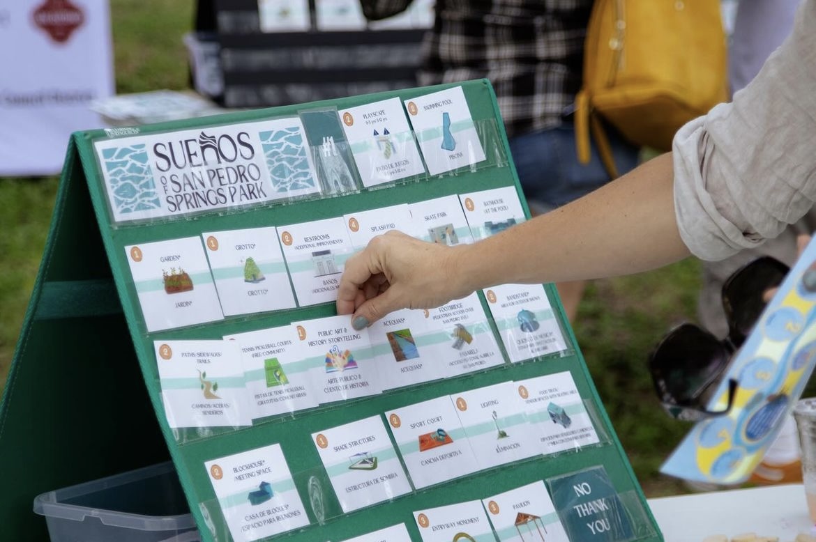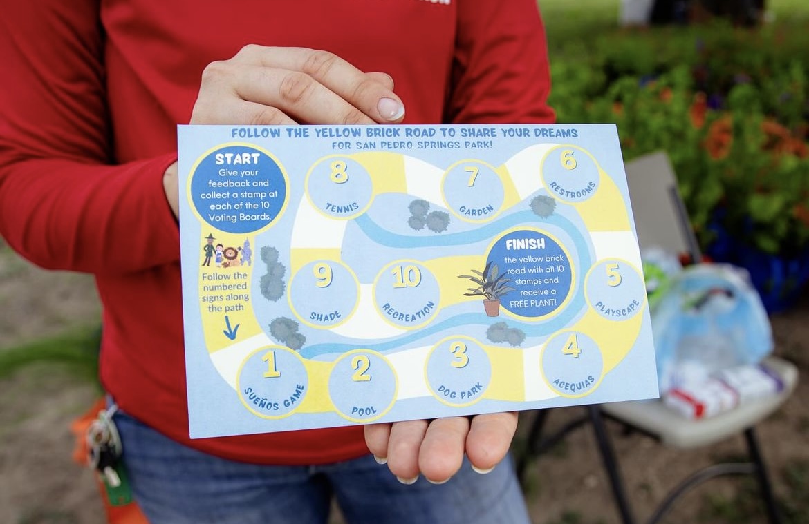 The board game functioned as a branded landscape map of San Pedro Springs Park, designed to mirror the real features and possibilities of the site. Residents used custom game pieces and cards — each representing potential amenities and improvements — to assemble their own “dream park.” This hands-on format made planning tangible, imaginative, and accessible for all ages.